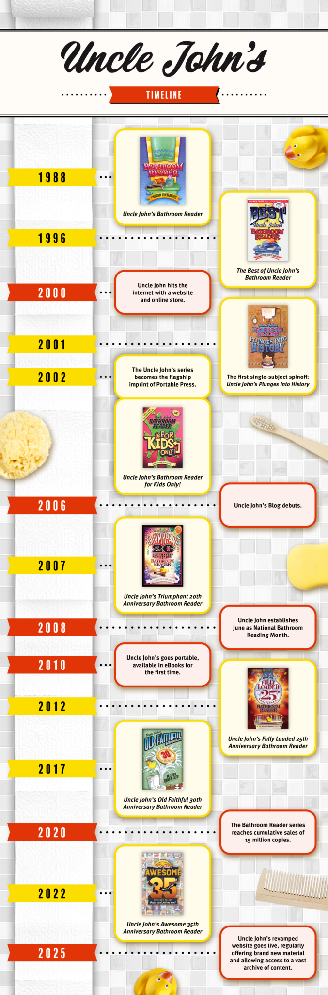 It was 1987 when Uncle John got the idea for what would become the greatest trivia book series of all time: Uncle John’s Bathroom Reader. The concept of reading in the bathroom is much older, as it’s a solo period of quiet reflection ideal for educating oneself with the written word in relatively small doses. And that’s how Uncle John found himself in such a moment of distress that it led to the creation of the perfect bathroom reading book. Stuck in a bathroom for a few minutes with nothing to read, it occurred to Uncle John that there ought to be a go-to book that all bathroom readers can enjoy, with interesting articles and fun facts on every subject imaginable, and in a variety of lengths, too, ensuring that there would always be something for all to enjoy and for their unique sitting period needs.