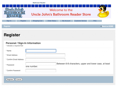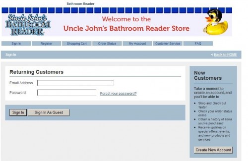 Because this is a new system, orders placed through the old store will no longer be visible to you. We know it’s a pain, but if you have any questions about those old orders—that’s any orders placed before February 15, 2010—you can contact orders@bathroomreader.com, and we’ll look into them personally.