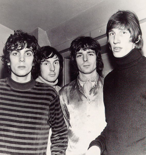 Image of the band (in 1967) from the Syd Barrett Scrap Book. (Click the pic to enlarge.) Left to right: Syd Barrett, Nick Mason, Richard Wright, and Roger Waters.