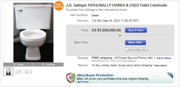 The description reads: “Here’s an item you won’t come across everyday! This is the toilet that was personally owned AND used by J.D. Salinger for many years! It sat in his home in Cornish, New Hampshire, and was installed in the ‘new wing’ of his house. When he died, his wife inherited all of his manuscripts with plans to eventually release some of them! Who knows how many of these stories were thought up and written while Salinger sat on this throne!”