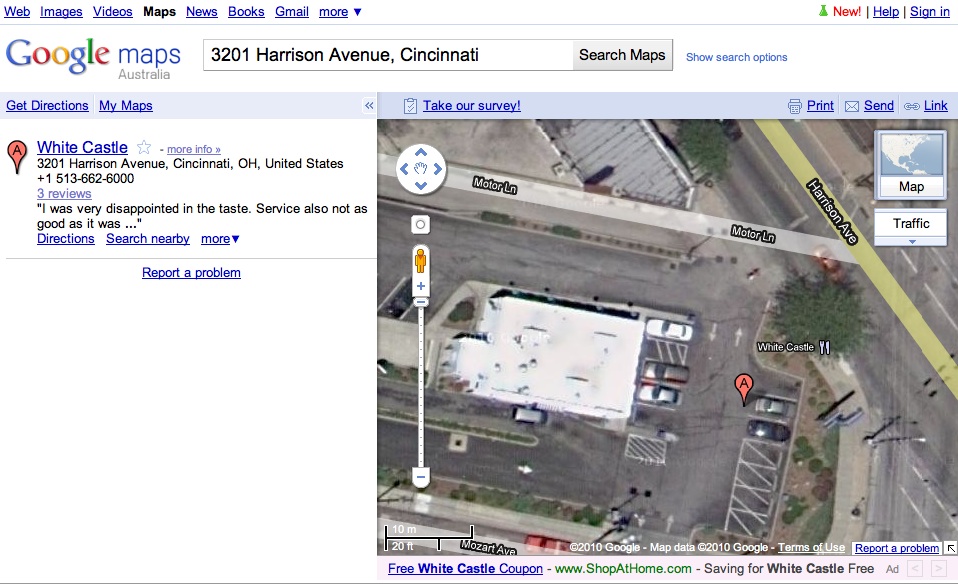 In April, William Ferris called police in Cincinnati, Ohio, to report that he’d been robbed the in bathroom of a White Castle restaurant bathroom. Only he hadn’t been robbed: He’d paid a prostitute to provide services for him in said bathroom, and he hadn’t been happy with those services. So he called police. He was arrested and charged with solicitation and making a false police report. (Photo of actual Cincinnati White Castle where Mr. Ferris went for some bathroom fun provided by Google Maps.)