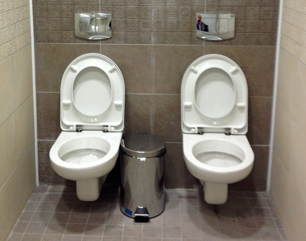 The tandem toilets were separated by a small trash can instead of a wall. Even weirder, there was only a single roll of TP and it was within reach of just one of them. Rosenberg snapped a photo of the crazy commodes and published it on his Twitter account. His followers offered their thoughts. Some theorized that the toilets were a sign of Russian corruption—corners cut by organizers—or simply a blunder.