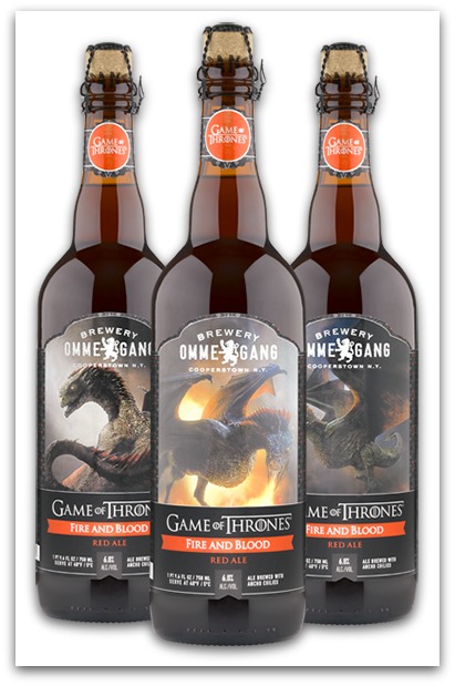 For a couple of years, Cooperstown, New York, brewery Ommegang has been brewing two beers based on HBO’s Game of Thrones: Iron Throne Ale (and ale) and Take the Black Stout (a dark stout). Going on sale on March 31, a week before the new season starts, Ommegang will introduce its third GOT beer, Fire and Blood Red Ale. “Fire and Blood” is the motto of the show’s House Targaryen, as led by Daenerys Targaryen, “the mother of dragons.” Each bottle depicts one of three different dragons. Collect ‘em all!