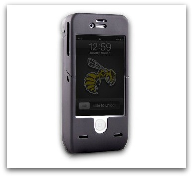 Yellow Jacket is a $100 plastic iPhone case—available in yellow (and gray), it fits around the phone, protecting it if it’s dropped. It also purports to protect the phone from theft and the user from attack—a flip of a switch and the Yellow Jacket becomes a 650,000-volt stun gun…after letting it charge up for a few precious seconds, however.