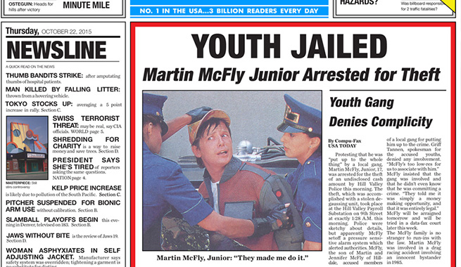 In the film, Marty’s son is arrested for theft and the incident is, apparently, important enough to warrant a front page story in USA Today. Once his father races to the future and prevents the event from happening, the paper morphs into a story about a group of bullies getting nabbed by authorities instead. The October 21st edition of the real USA Today featured a reprint of the film’s first version wrapped around each copy.