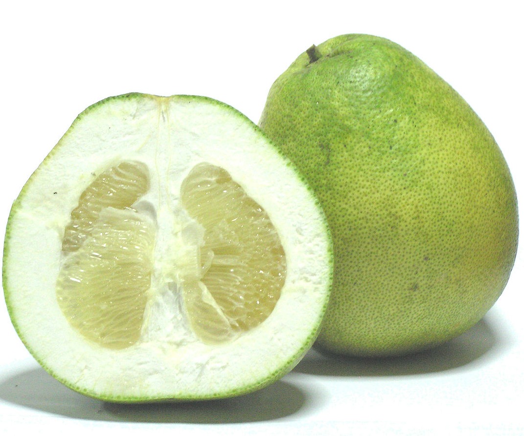 A green thickskinned cousin of the grapefruit. It’s not as juicy as a grapefruit, but it can grow as large as a basketball.