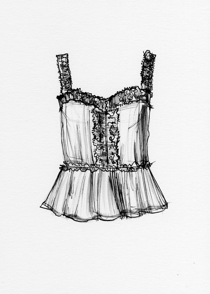 Origin: The word is French, from the Latin camsa, or “shirt.” The camisole evolved from a simple corset cover in the mid-19th century. Designed to protect the dress from the corset, it was often decorated with embroidered flowers. The camisole itself evolved into two other undergarments: combined with knickers, it became the teddy, and joined with the petticoat, it became the slip.